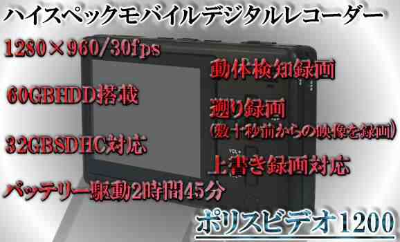 ●バッテリ駆動時間は脅威の2時間45分(SVRカメラに電源供給状態)! 本体内蔵の充電式リチウム電池をフル充電した場合、SVRシリーズのカメラに電源供給したまま録画をしても2時間45分(LCDバックオフ状態での実績)の使用が可能です。また、予備用のリチウムイオン充電池が付属(合計2個)しているので、あらかじめ充電を済ませておけば充電池を切り換えて連続で使用する事が出来ます。 さらに予備電池が必要な方は、別売 5,800円で販売しております。ご注文の際は備考欄に「ポリスビデオ1200専用予備電池追加希望」と記入下さい。